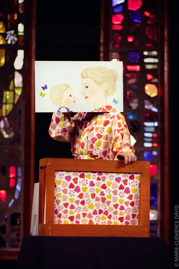 Dans le décor d’un arbre aux feuilles multicolores, un bébé fraîchement sorti de son cocon part en quête d’un « nouvel endroit » où il se sentirait moins à l’étroit. En compagnie de son ami le chat, il passe d’une « maison » à l’autre : le tronc de la chouette trop petit, le terrier des loirs trop noir… Finalement, l’enfant, un peu fatigué, trouve une paire de bras qui le mène au plus beau des endroits, un endroit parfait pour lui et pour son chat. Grâce au kamishibaï, théâtre d’images en papier, et aux tapis d’éveil sur lesquels les enfants prennent place, Audrey Bonnefoy sème avec délicatesse les graines de l’imaginaire.